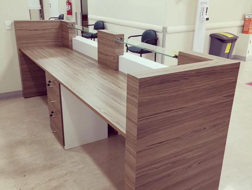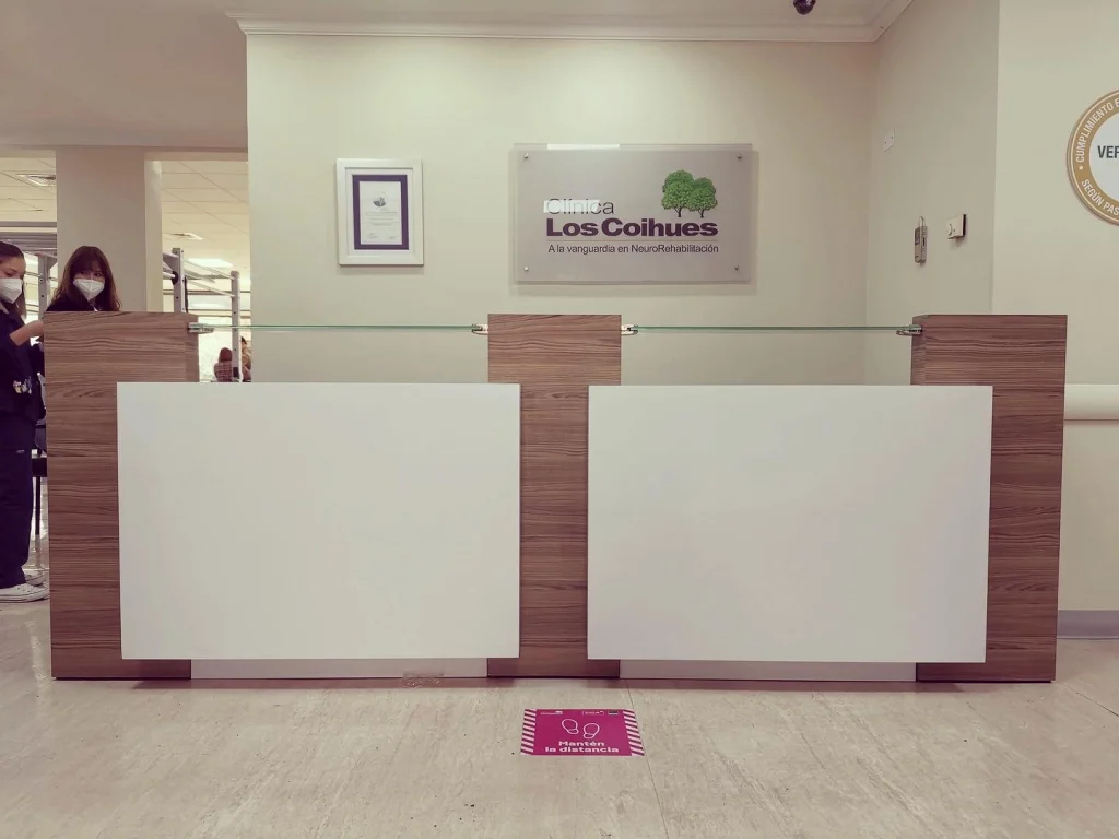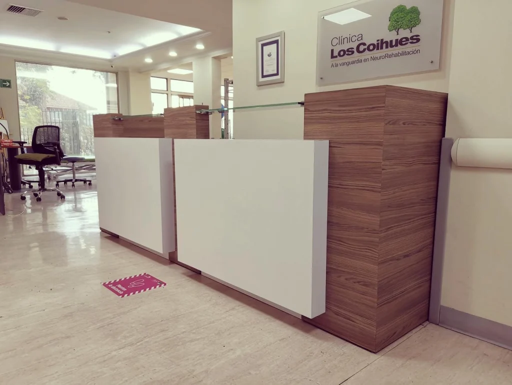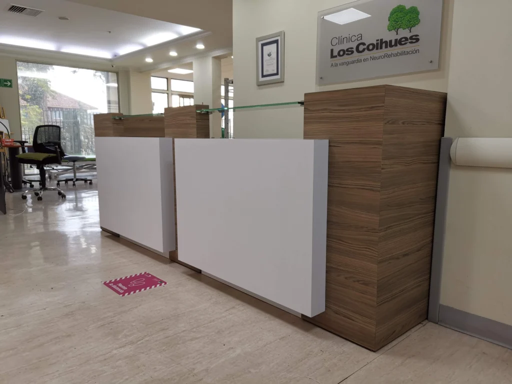 La recepción es el punto neurálgico donde comienza la experiencia del paciente. Para la Clínica Los Coihues, el objetivo era diseñar un área de atención que proyectara limpieza, profesionalismo y calidez, cumpliendo al mismo tiempo con las exigencias de un entorno de salud de alto tráfico.
